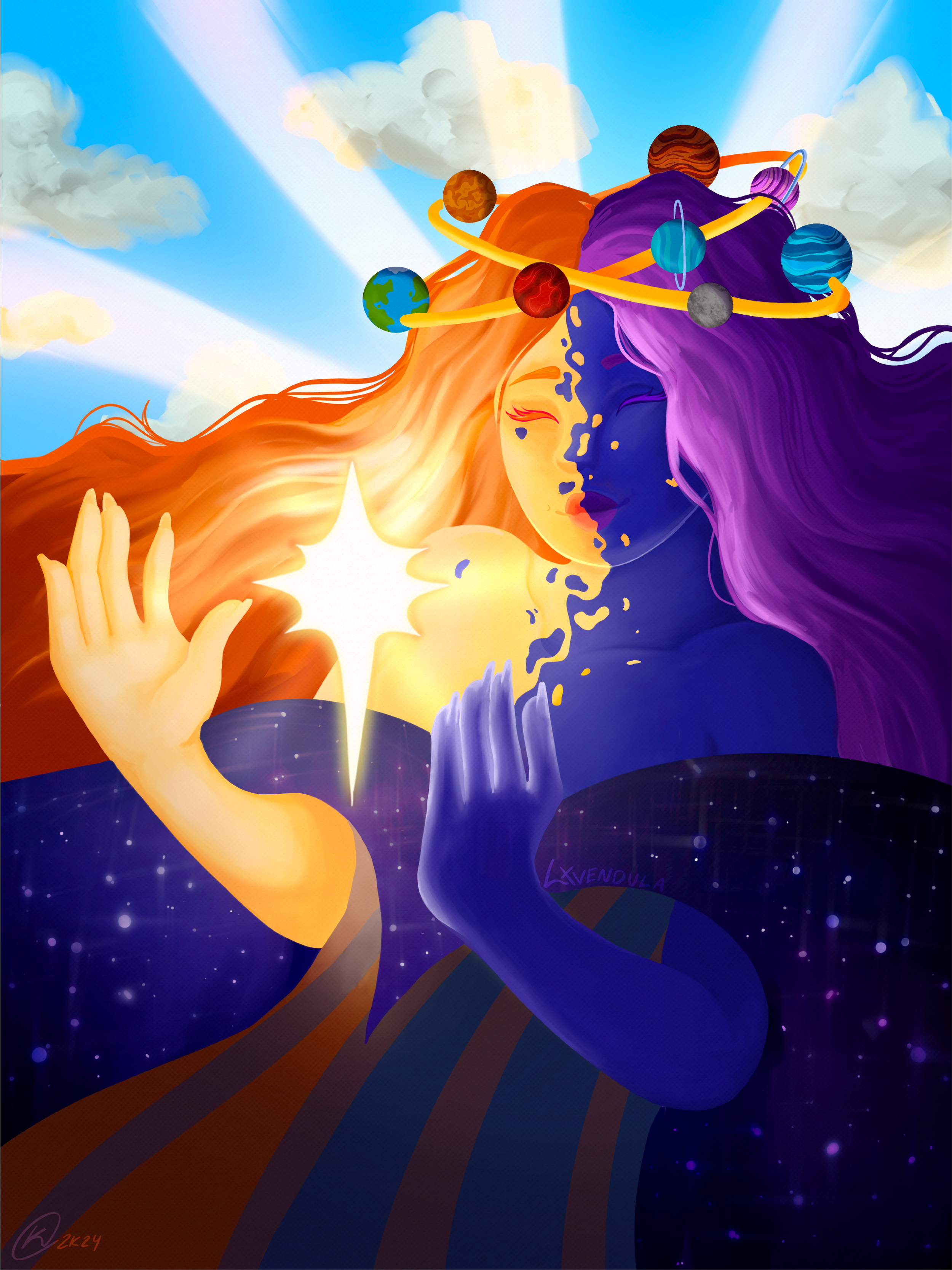 I am an enthusiastic "astrophile," or someone who loves stars, astronomy, and the cosmos. I dream of witnessing the stars fully and one day traveling to space. Inspired by this admiration, I created an illustration of a star-crossed character embodying both the sun and the moon. My goals included refining my composition skills with sky and galaxy elements and portraying her angelic, motherly nature, reflective of a potential creator of the universe. I also aimed for a painterly effect by minimizing linework in my drawing.